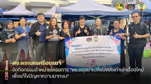 โครงการ "พช.อยุธยา เปลี่ยนของเก่า เล่าเรื่องใหม่ เพื่อแก้ไขปัญหาความยากจน" เป็นโครงการที่ดำเนินการมาตั้งแต่ปีงบประมาณ พ.ศ.2568 โดยรับบริจาคเสื้อผ้า และสิ่งของที่ไม่ใช้แล้ว และนำมาจำหน่ายหารายได้สมทบเข้ากองทุนสนับสนุนการดำเนินงานขจัดความยากจนและพัฒนาคนทุกช่วงวัยอย่างยั่งยืนตามหลักปรัชญาของเศรษฐกิจพอเพียง เพื่อช่วยเหลือครัวเรือนเป้าหมายตามระบบ TPMAP ครัวเรือนเปราะบางและครัวเรือนด้อยโอกาส ในพื้นที่จังหวัดพระนครศรีอยุธยา กำหนดดำเนินการทุกวันอังคารที่ 1 และ 3 ของเดือน ณ ตลาดนัดคนไทยยิ้มได้ ศาลากลางจังหวัดพระนครศรีอยุธยา