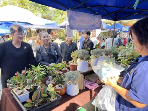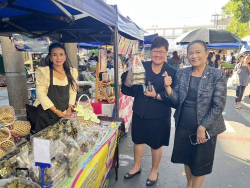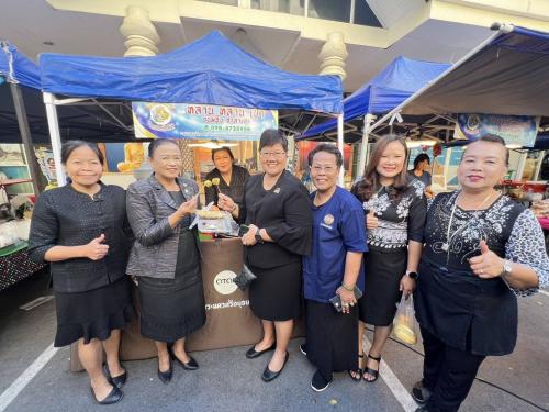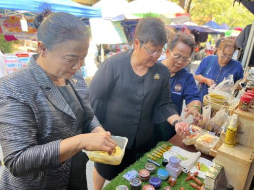 จากนั้นได้เยี่ยมชมและให้กำลังใจ สนับสนุนผู้ผลิต ผู้ประกอบการ OTOP และกลุ่มอาชีพ ที่มาจำหน่ายสินค้าในตลาดนัดคนไทยยิ้มได้ ซึ่งจัดขึ้นทุกวันอังคาร ณ ศาลากลางจังหวัดพระนครศรีอยุธยา เพื่อส่งเสริม ผลิตภัณฑ์ชุมชน ผลผลิตทางการเกษตร และผลิตภัณฑ์ OTOP ที่มีศักยภาพ ให้นำสินค้ามาจำหน่ายภายในตลาด เป็นการเพิ่มช่องทางการตลาดให้ผู้ประกอบการมีสถานที่จำหน่ายสินค้าถาวร